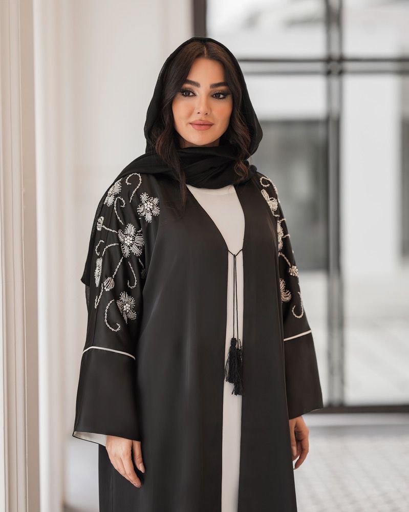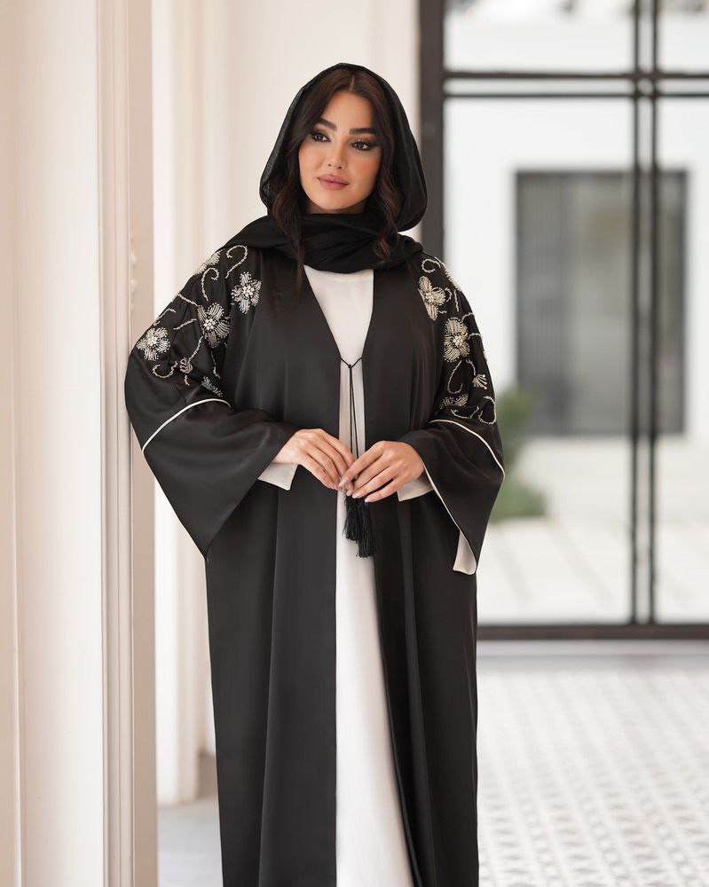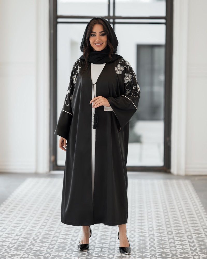 تقدیم به شمایی که هر عبایی نمیپسندی عبا گل نرگس عبا اماراتی 2 تیکه جواهر دوزی کار دست زیر ساتن سفید +رویه آیشقی مناسب سایز 44-54 قد کار 128 سانتی متر
