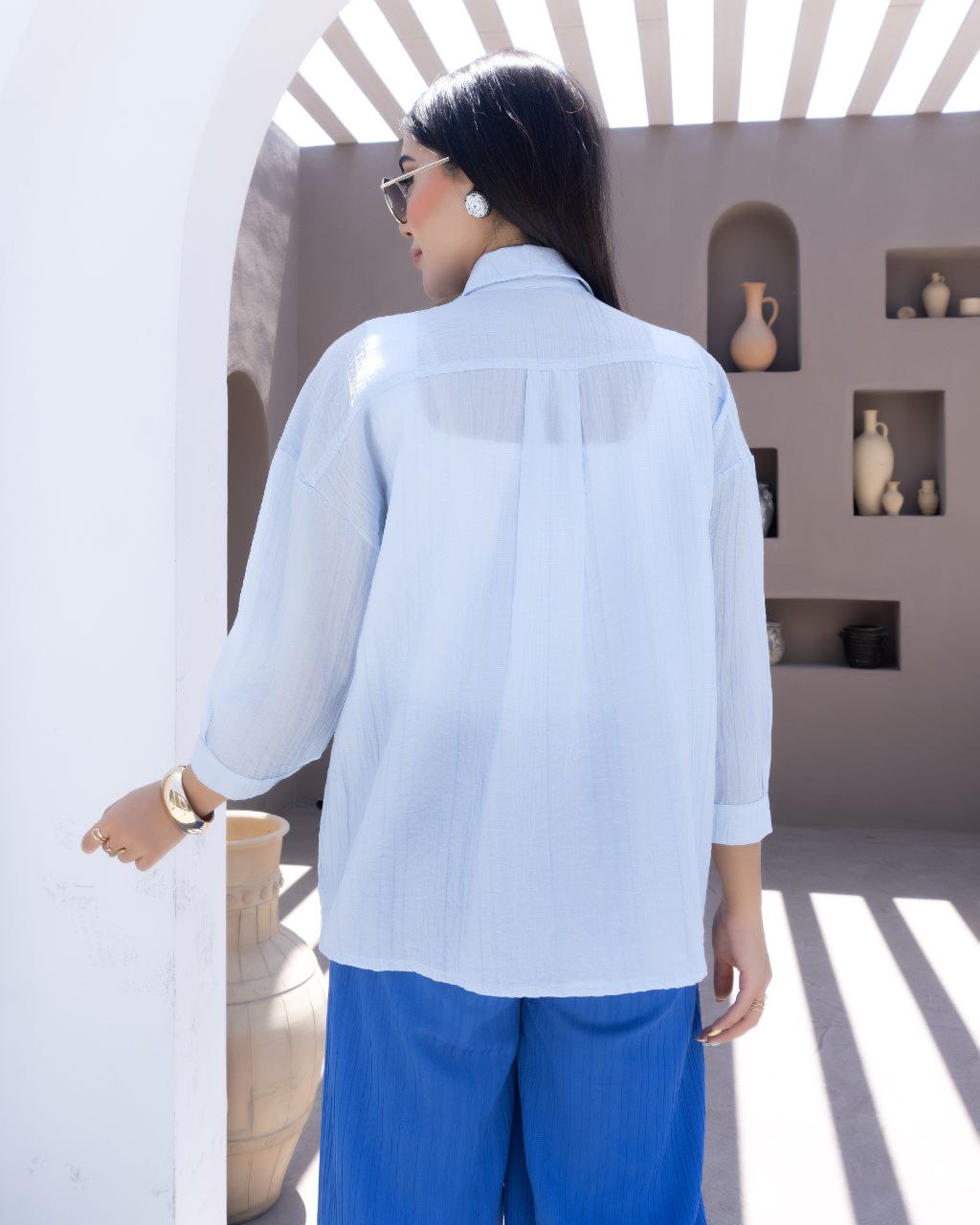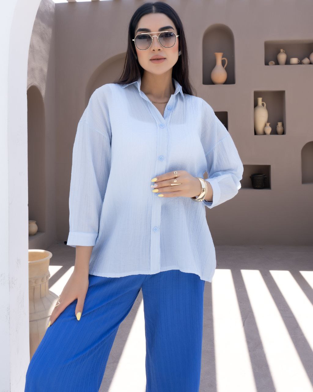 شومیز پری کار وارداتی دوخت بسیار تمیز و عالی کار دخترونه شیک مناسب فصل بهار کار بسیار خنک و لخت جلو کار دکمه دار قد کار 66 سانتی متر یقه ساده استین سه ربع و یک دکمه میخورد در رنگ بندی کرم .نسکافه ای .ابی .سبز. صورتی چروک نمیشه